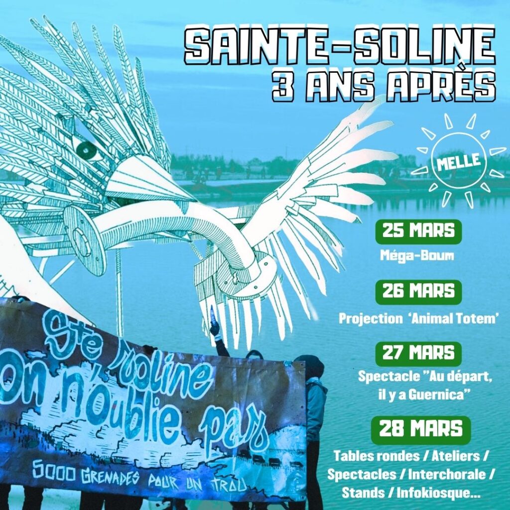 SAINTE-SOLINE, 3 ANS APRÈS ! ÇA SE PASSE DU 25 AU 28 MARS À MELLE # 3 ans après Sainte-Soline : nous sommes toujours là ! Il y a trois ans, des dizaines de milliers de personnes opposées aux méga-bassines se retrouvaient au milieu des…